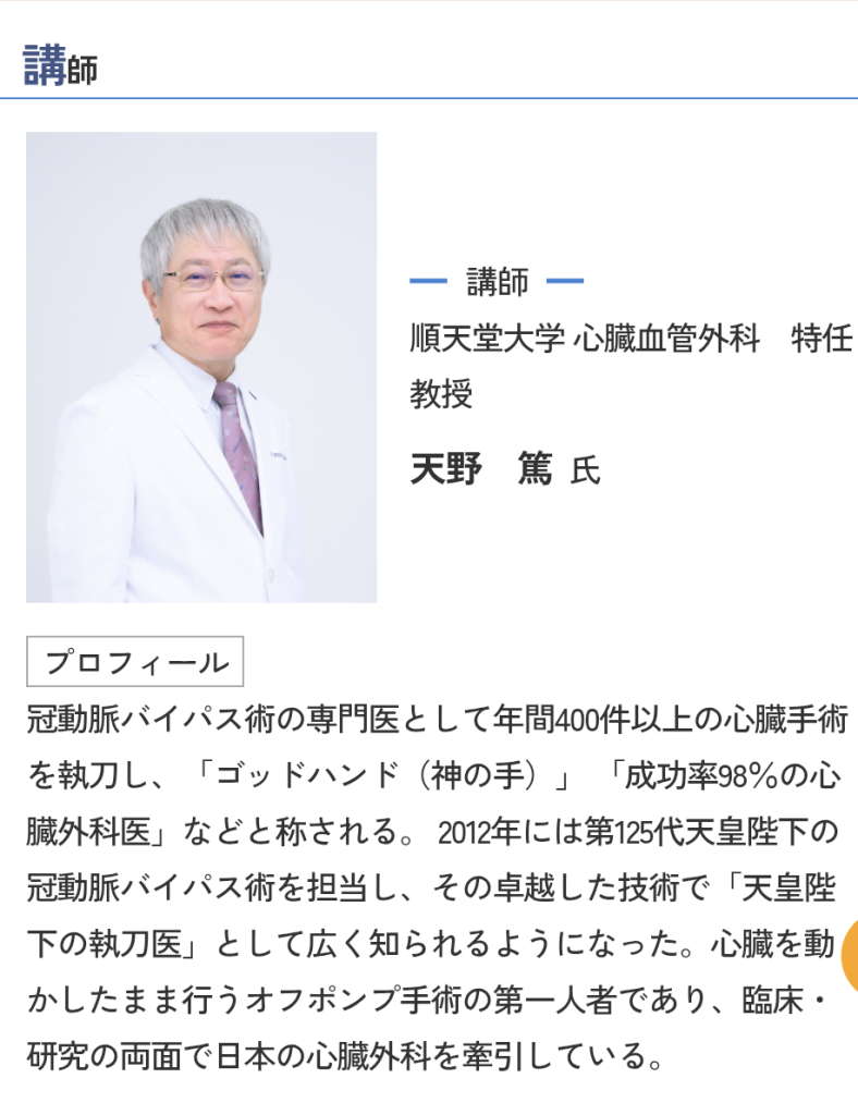 天野先生は上記のプロフィールにもある通り、天皇陛下の執刀医としても有名な心臓外科の第一人者です。天野先生が天皇陛下の冠動脈バイパス手術を行ったのが2012年、レガーレデンタルクリニックが開業した年と同じです。